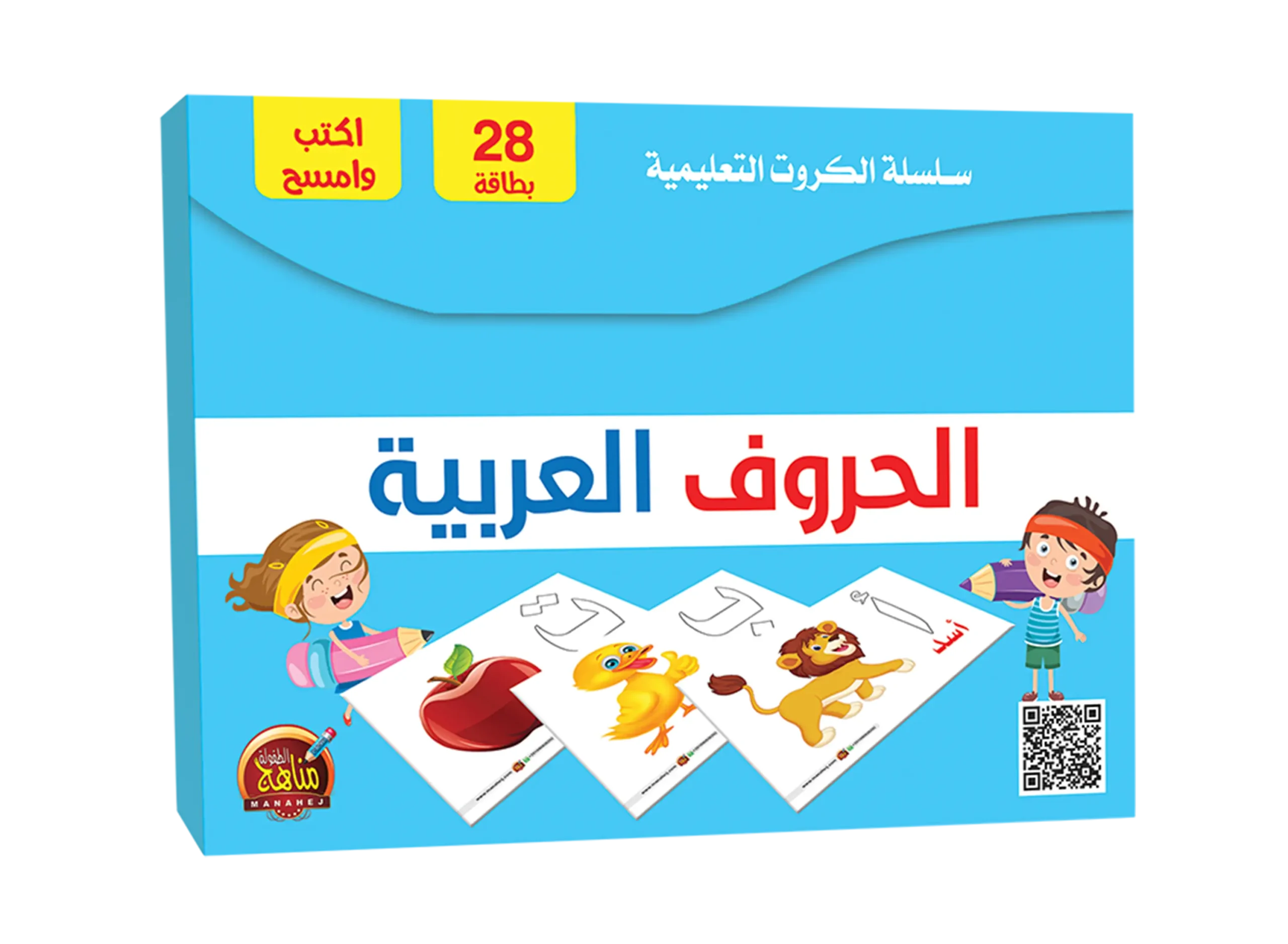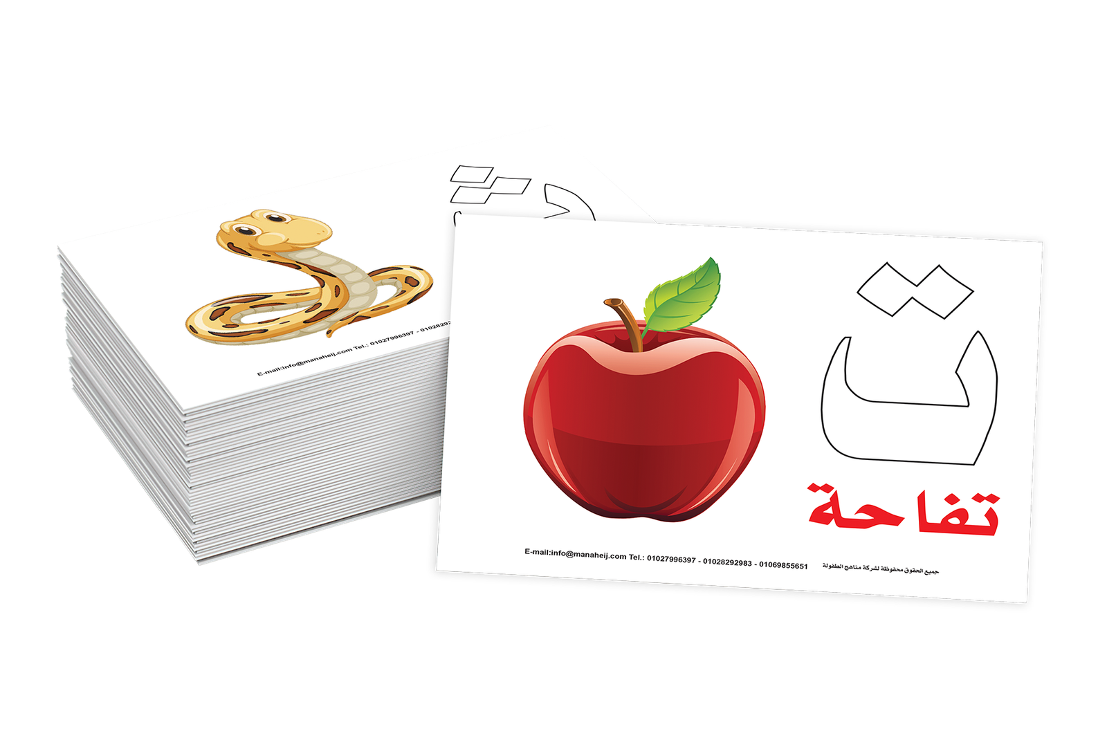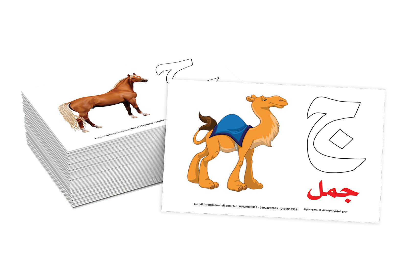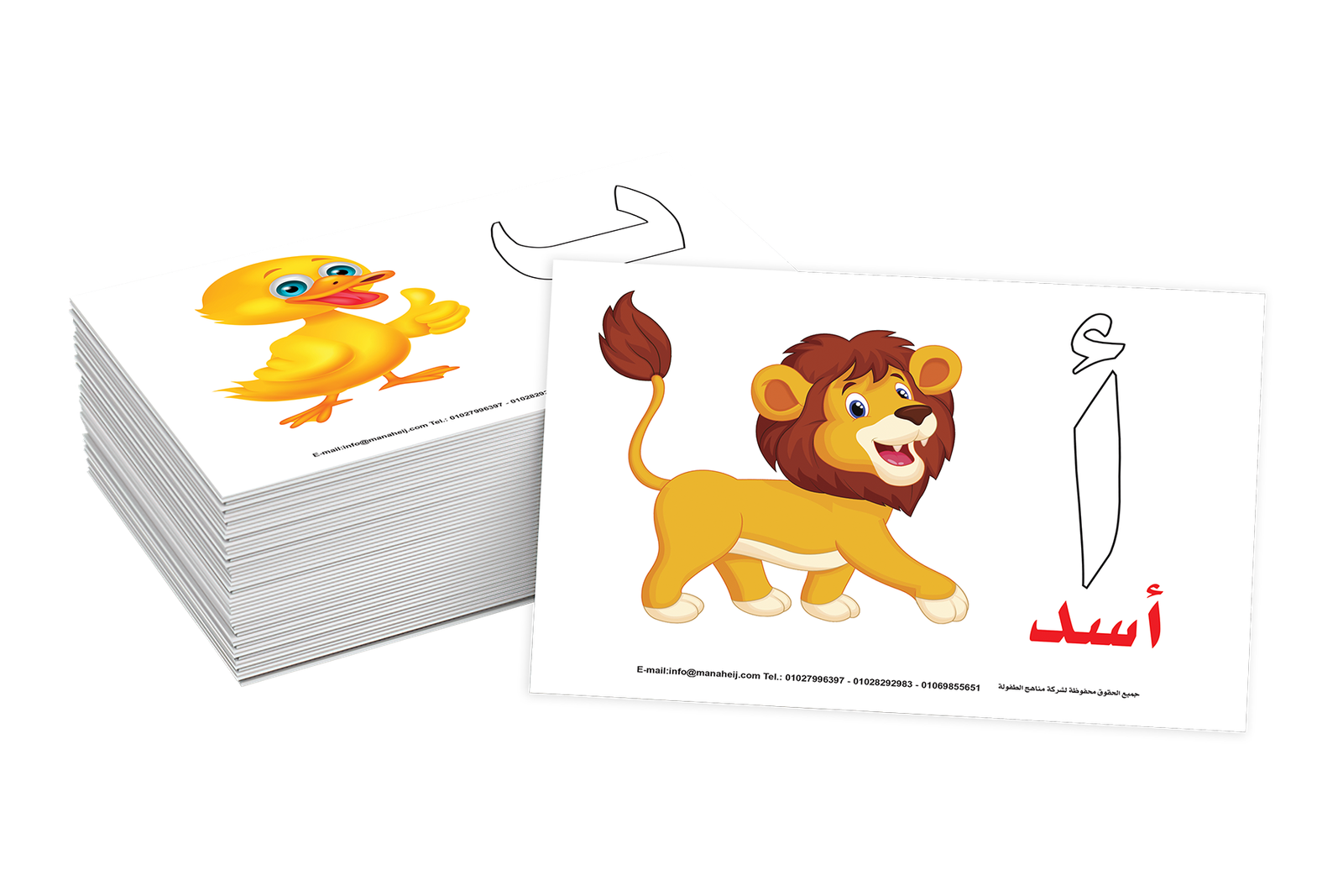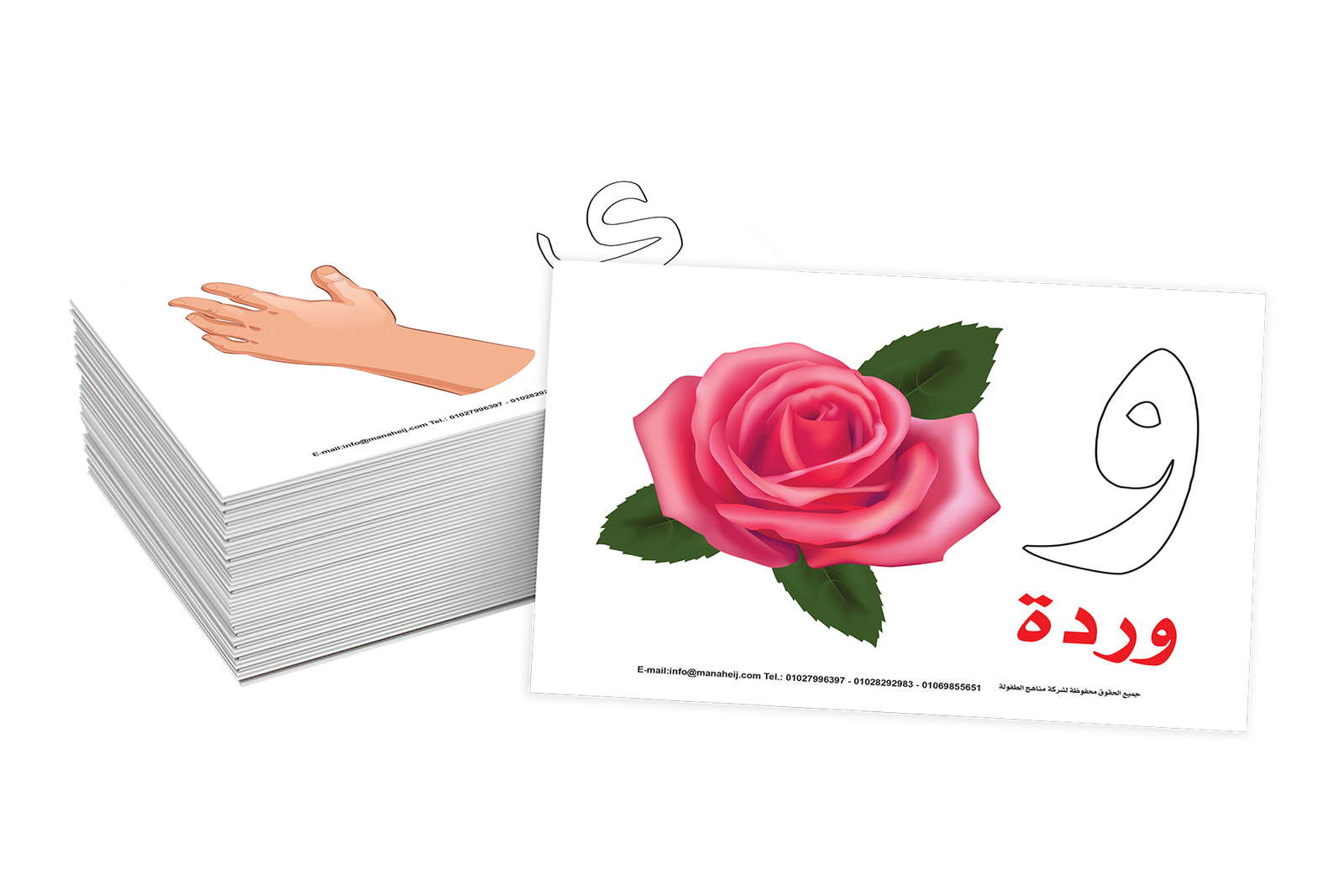 بطاقة لكل حرف من الحروف العربية تستعين بها المعلمة في توضيح كل حرف على حدة دون مدلولات من جهة وجهة أخرى بالمدلول بشكل محبب للأطفال الذين يتعرفوا على الحروف لأول مرة ،ويمكن استخدامها كلعبة شيقة للأطفال بالبحث عن أشياء من حولهم يبدأ بحرف ترفعه المعلمة.