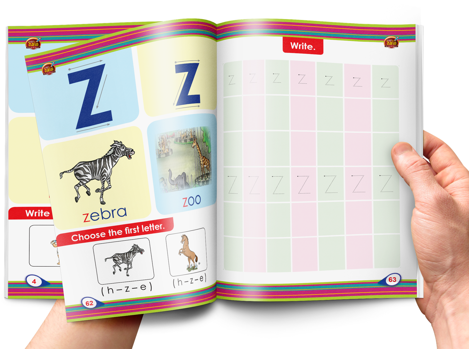 - يشمل الكتاب العديد من التدريبات والاختبارات لقياس مدى استيعاب الطفل وإتقانه لكتابة الحرف في نهاية الكتاب.