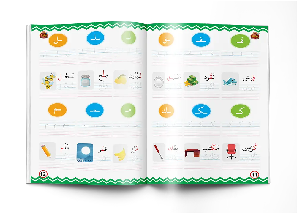يتعلم الطفل موضع الحرف في أول الكلمة ووسط الكلمة ونهاية الكلمة مع أمثلة عليها لزيادة التوضيح.